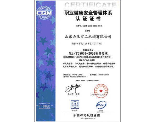 职业健康安全管理认证证书